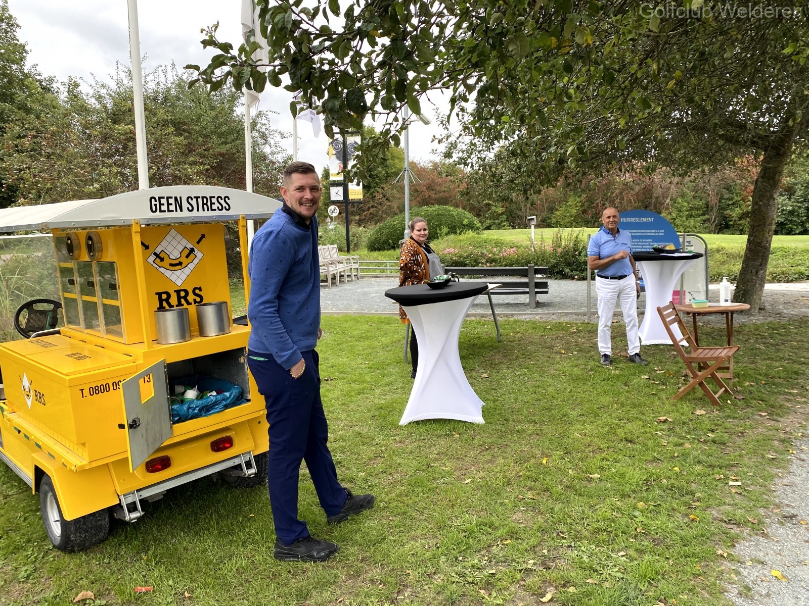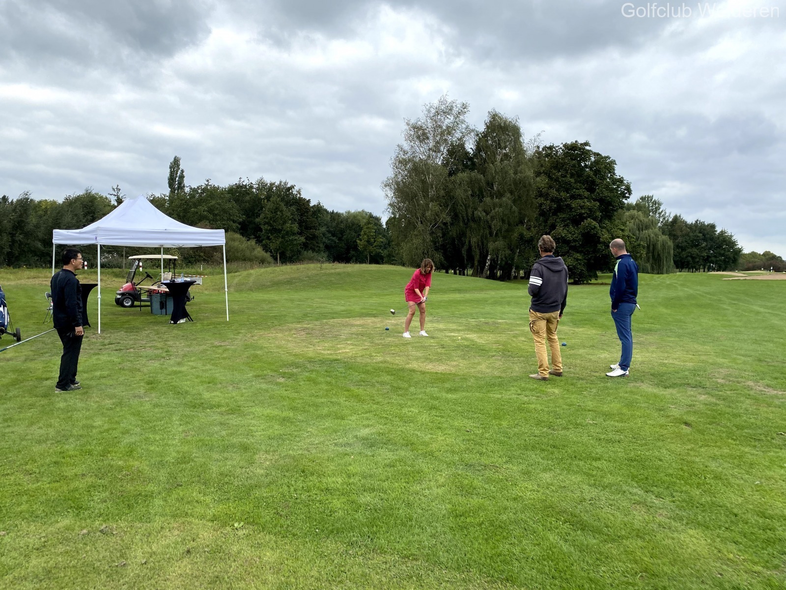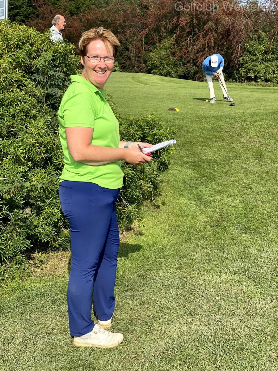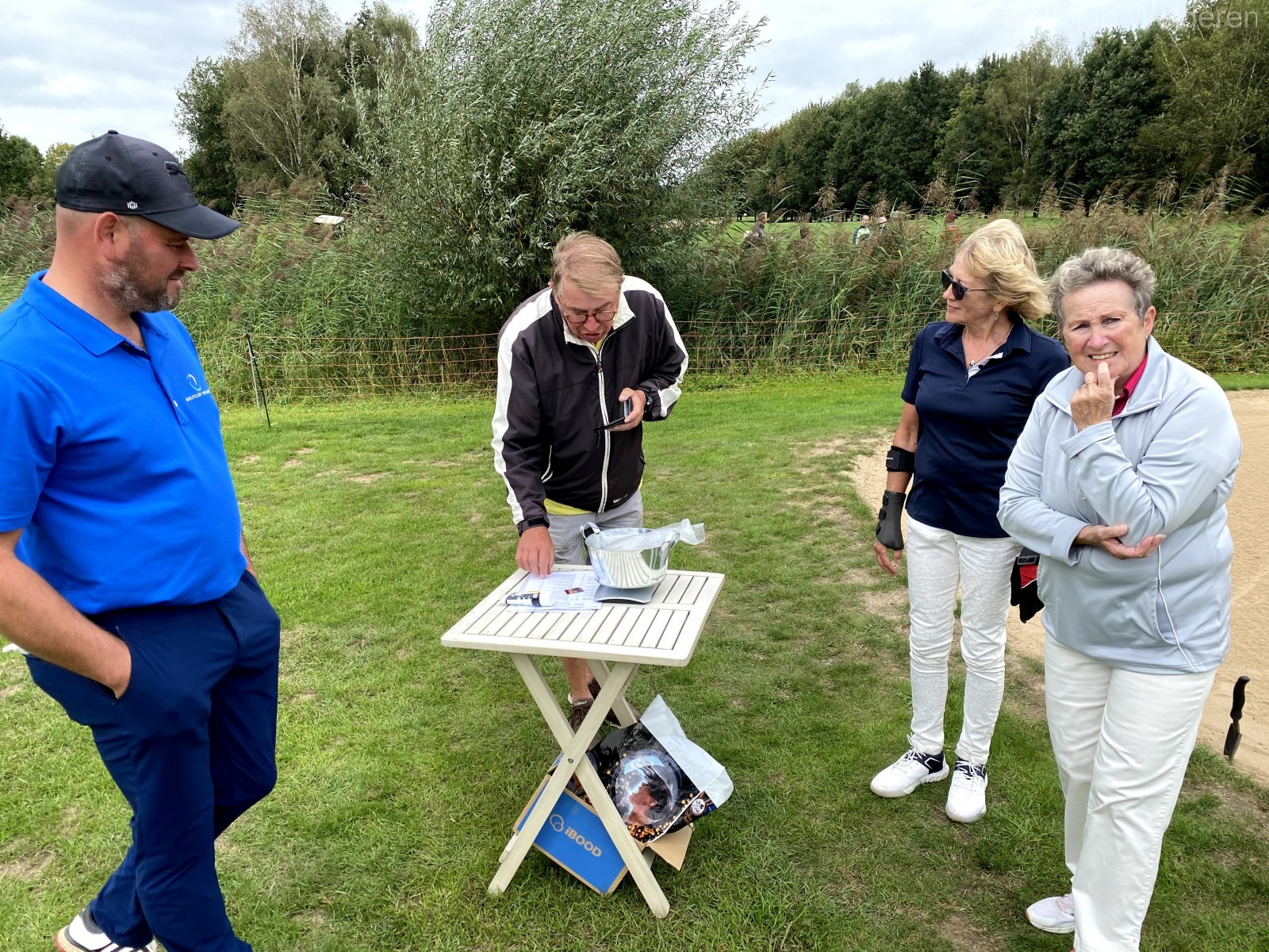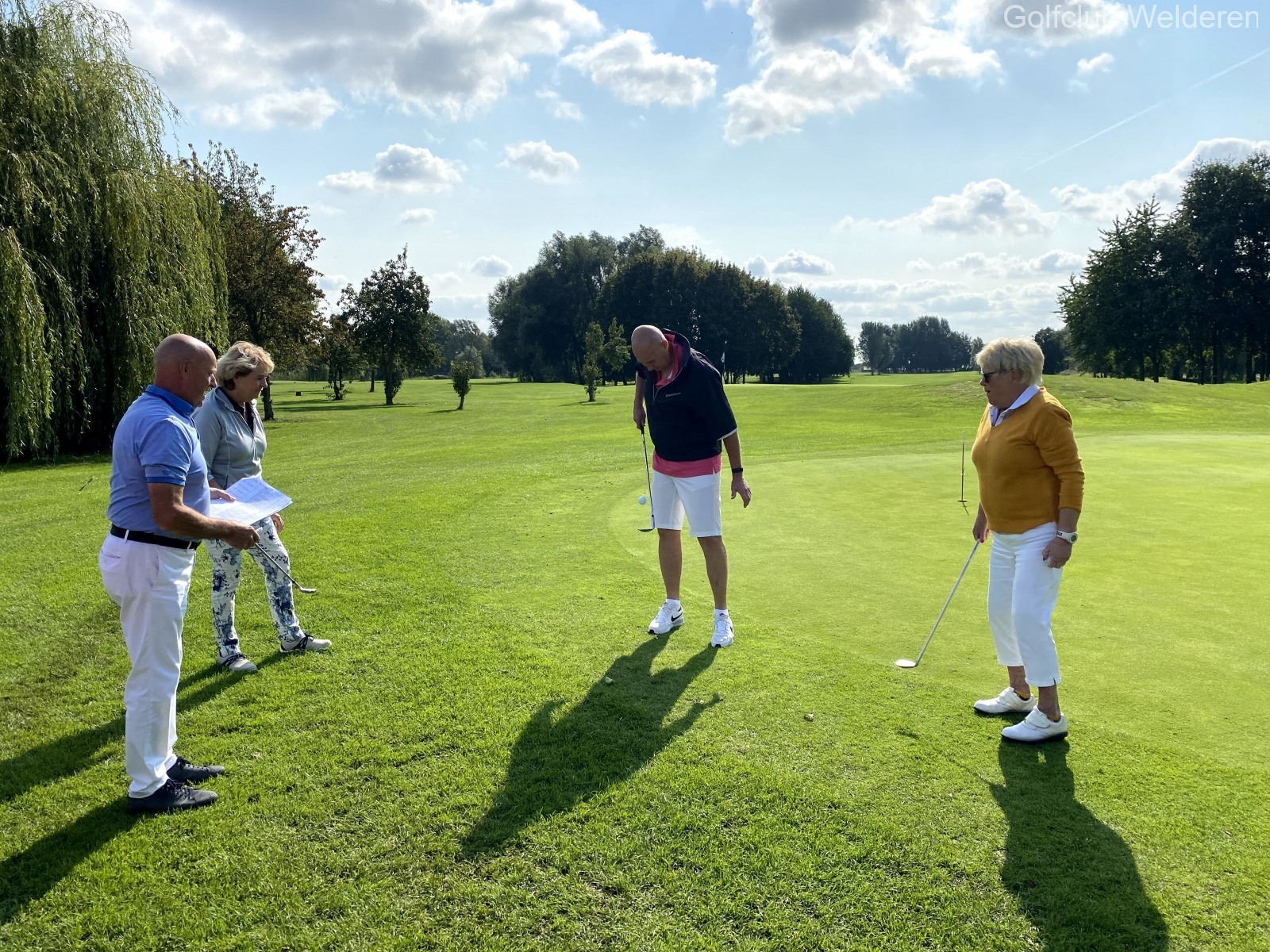 Op hole 1 was het al een gezellige bedoeling. De drukte was enigszins verdeeld met een flight die al klaar stond op de tee-box, leden die nog even de snelheid van de putting green aan het testen waren, deelnemers die genoten van een kop koffie of thee met een alternatieve ‘Welderen’ koek (ik stel voor dat wij deze erin houden!), en ….?? Een aantal personen die verwoede pogingen deden om een golfballetje met hun clubblad omhoog te houden. Mij werd uitgelegd dat je alleen baanpermissie kreeg voor hole 1 wanneer je had aangetoond dat je op zijn minst 5 keer een bal omhoog zou weten te houden… Later werd dit beeld gelukkig bijgesteld door een vrijwilliger van de wedstrijdleiding.